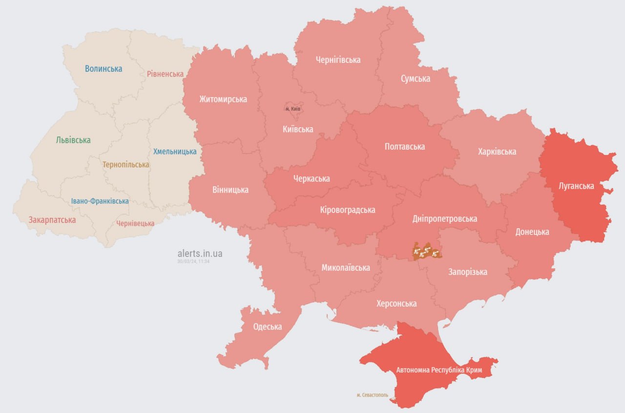 08:00 Ночью 30 марта 2024 года россияне ударили по Украине 4-мя зенитными управляемыми ракетами С-300/С-400  и беспилотниками.