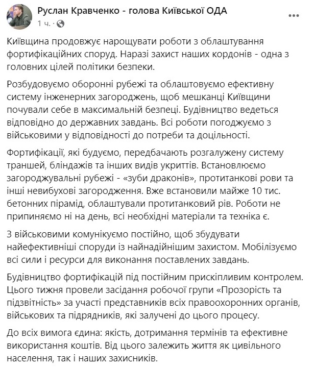 Кравченко отметил, что мобилизованы все силы и ресурсы для выполнения поставленных задач. Также идет постоянная коммуникация с военными, чтобы построить самые эффективные сооружения с самой надежной защитой.