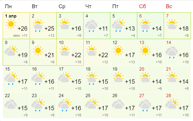 В Киеве апрель начнется с +26 градусов днем. Такое тепло продержится до 2 апреля. Затем похолодает +16, и эта дневная температура будет считаться среднемесячной. Заморозков уже не ожидается даже ночью. Дождь будет идти около десяти дней, но небольшой - ливней не прогнозируется.