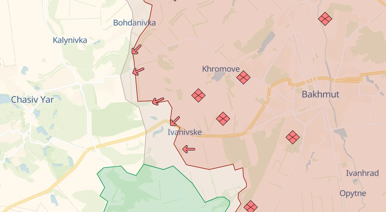 Deep State пишет, что россияне продвинулись с востока к Часов Яру - ключевому центру обороны украинской армии между Бахмутом и агломерацией Славянск-Краматорск-Дружковка-Константиновка. Российские паблики утверждают, что их войска находятся уже вблизи восточных окраин Часов Яра.