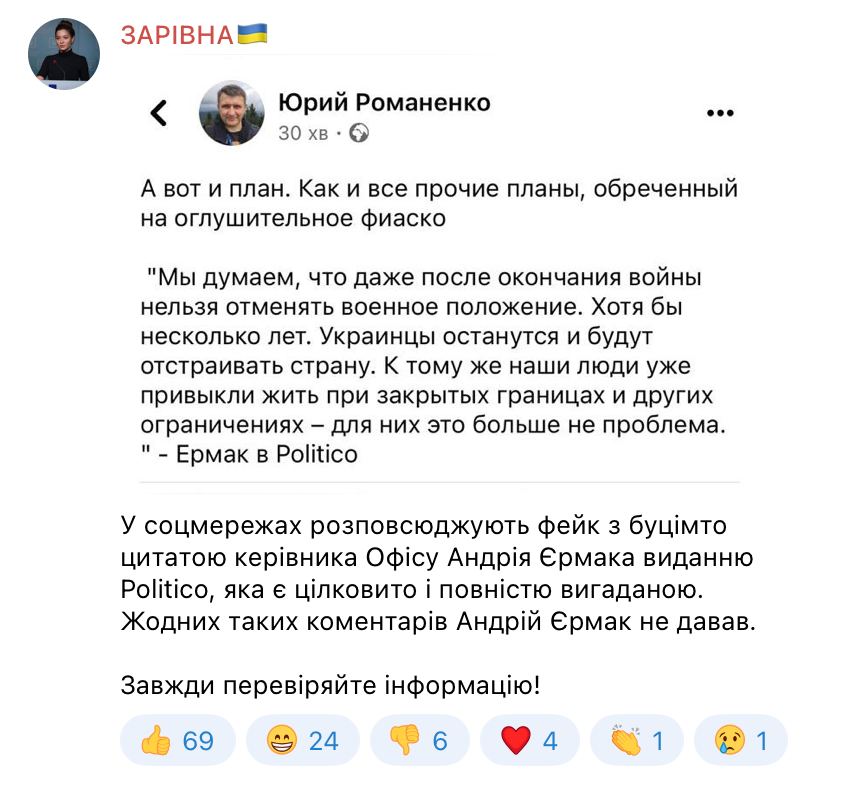 "В соцсетях распространяют фейк с якобы цитатой руководителя Офиса Андрея Ермака изданию Politico, которая является полностью вымышленной. Никаких таких комментариев Андрей Ермак не давал. Всегда проверяйте информацию!", - написала Заривная.