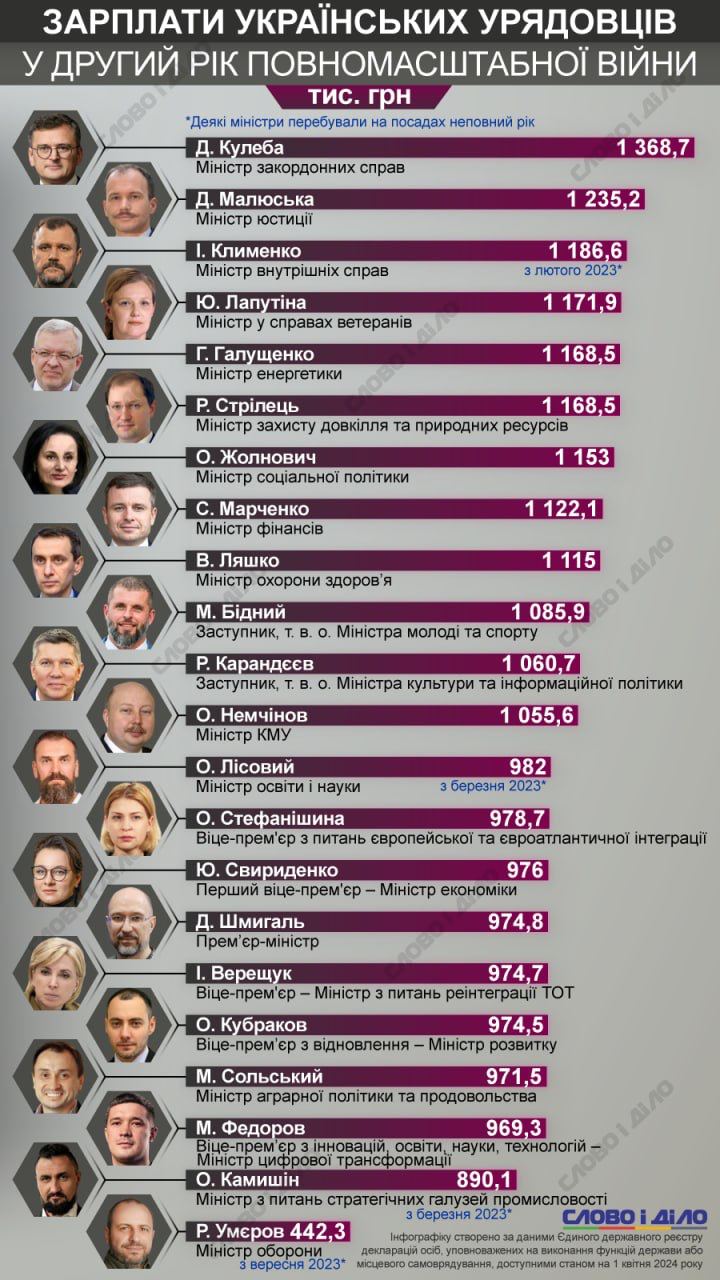 После Кулебы следуют министр юстиции Денис Малюська (1,23 млн) и глава МВД Игорь Клименко (1,19 млн).