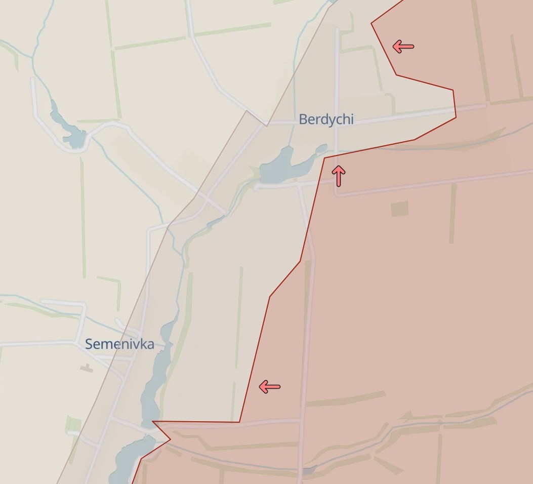 Также российские паблики пишут, что сегодня их войска пошли на крупный штурм западной части Бердычей и Семеновки. В Украине этого не подтверждали. На карте Deep State Бердычи частично под РФ, остальное в серой зоне.
