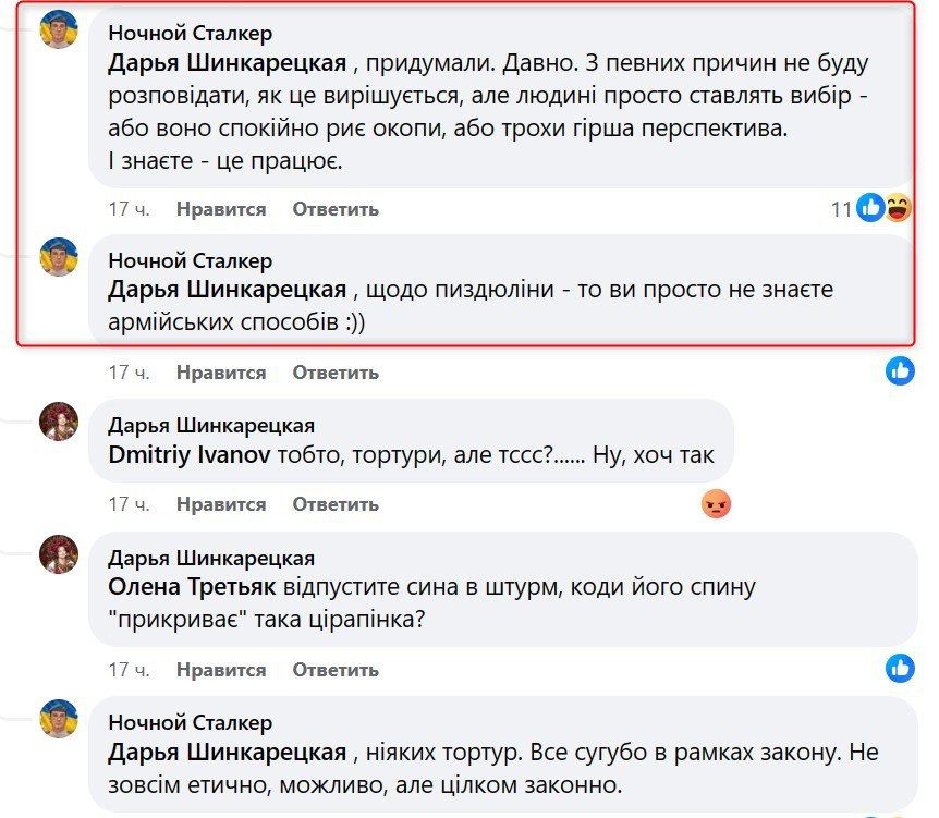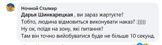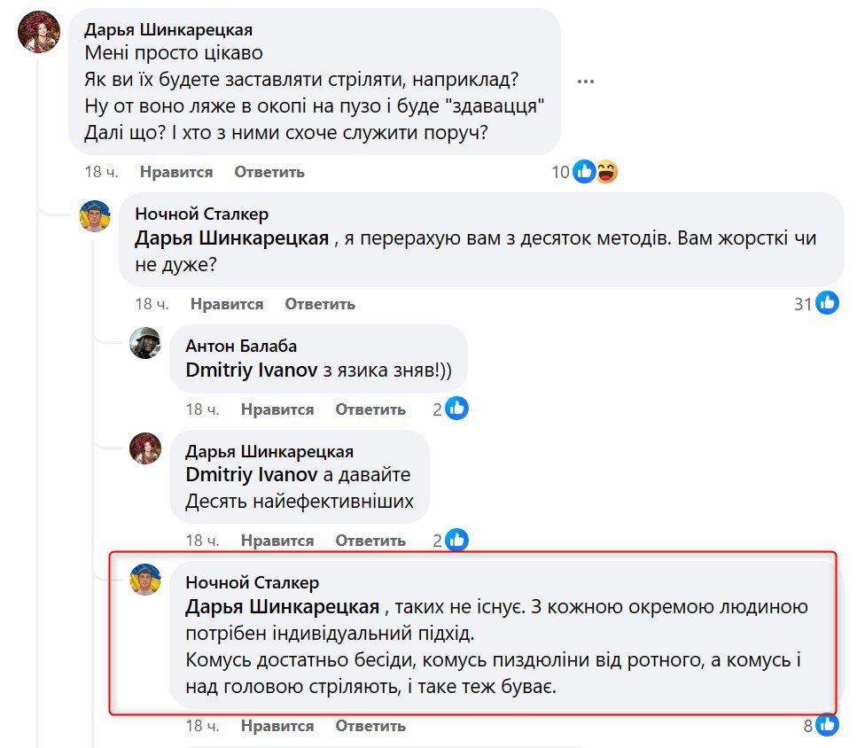 На вопрос комментаторов, как заставить воевать немотивированного новобранца, который "ляжет в окопе на пузо и будет сдаваться", Ночной Сталкер ответил, что "кому-то достаточно беседы, кому-то - пиз@юлины от ротного, а кому-то и над головой стреляют".