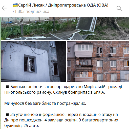 Уточнённые данные ущерба приводит глава Днепропетровской областной военной администрации Сергей Лысак в своем телеграм-канале.