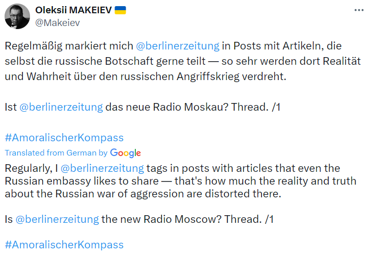 Макеев обрушился с критикой на газету Berliner Zeitung и заявил, что в статьях "искажается реальность и правда о российской агрессивной войне". И задал вопрос, не является ли издание "новым Радио Москвы", ссылаясь на то, что газету цитировало российское посольство.