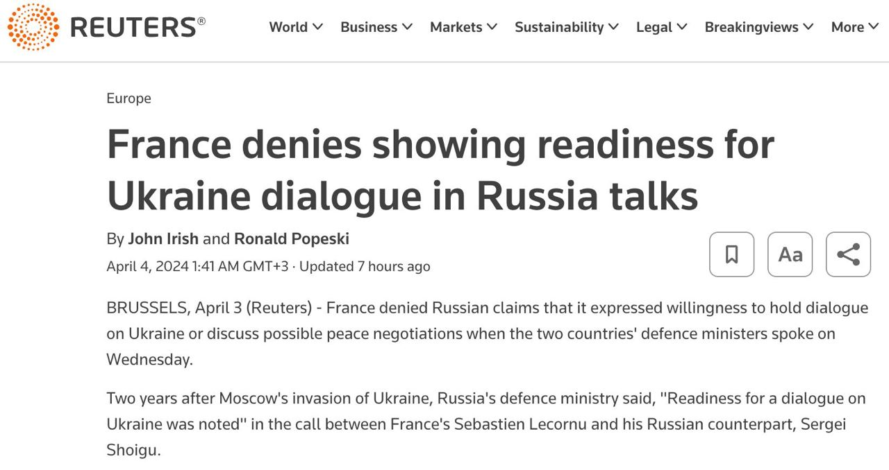 "Это неправда. Мы ни разу не проявили никакой готовности к диалогу по Украине, переговорам или чему-то в этом роде", - заявил источник издания в правительстве Франции.