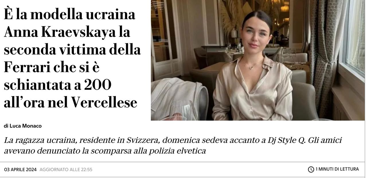 В Италии украинская 21-летняя модель Анна Краевская разбилась насмерть в изготовленном на заказ автомобиле Ferrari GTC4, мчавшем на скорости около 320 км в час.