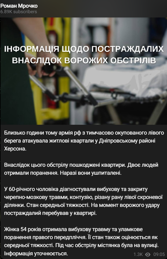 У 60-летнего мужчины диагностировали взрывную и закрытую черепно-мозговую травму, контузию, резаную рану левого височного участка. Он находится в состоянии средней тяжести. В момент вражеского удара пострадавший находился в квартире.