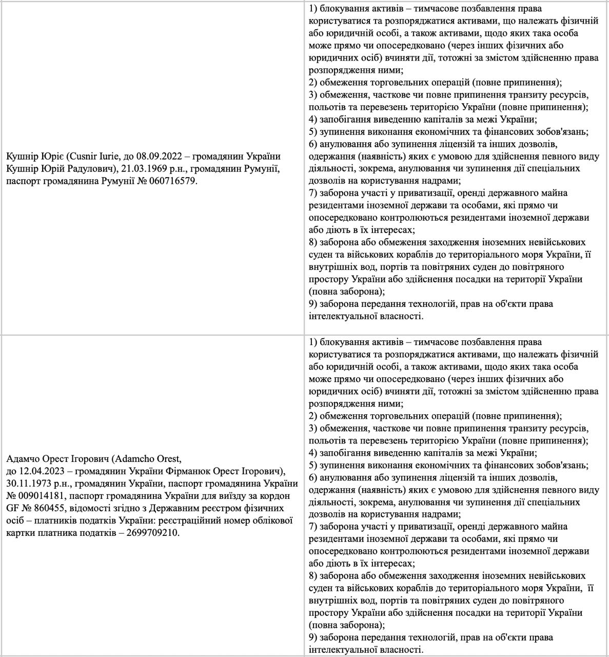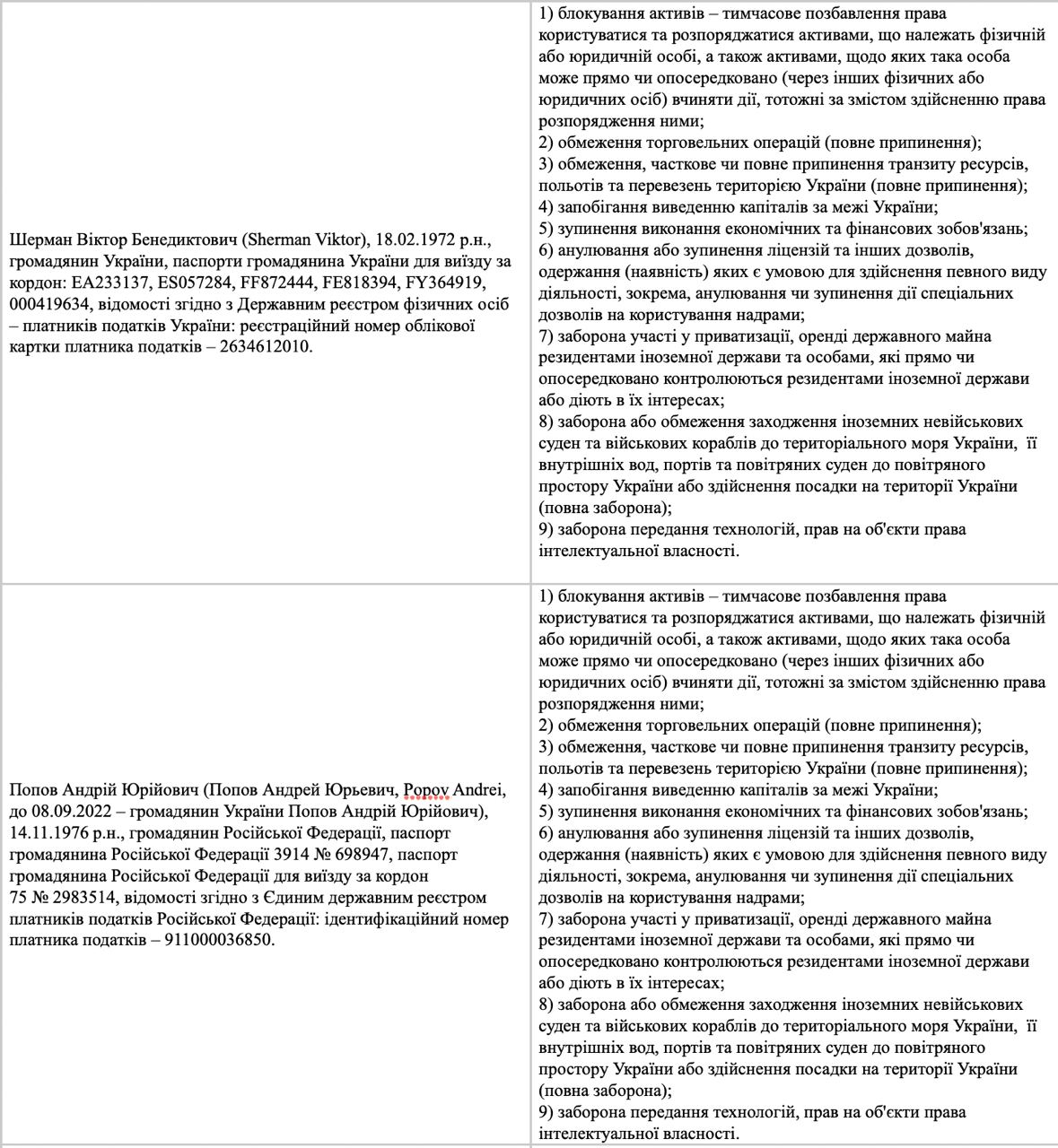 Также под санкции попали 86 компаний. 73 зарегистрированы на территории Украины, 2 – в оккупированном Мариуполе, 3 – в оккупированном Севастополе, остальные в РФ и Китае.
