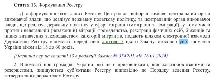 При этом далее говорится, что операторы реестра (Минобороны, Генштаб ВСУ, СБУ, Служба внешней разведки) будут удалять данные о гражданах, которые не являются военнообязанными.