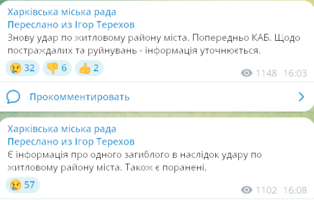 Сегодня днем Харьков вновь подвергся удару. По информации властей, управляемые авиационные бомбы (КАБ) сброшены на Шевченковский район. В результате минимум один человек погиб, есть раненые.