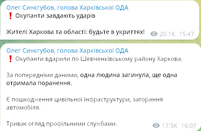 Об атаке сообщали в Телеграм глава Харьковской ОВА Олег Синегубов и мэр города Игорь Терехов.
