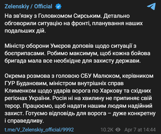 Также президент написал, что обсудил с главкомом Сырским ситуацию на фронте, планирование дальнейших действий.