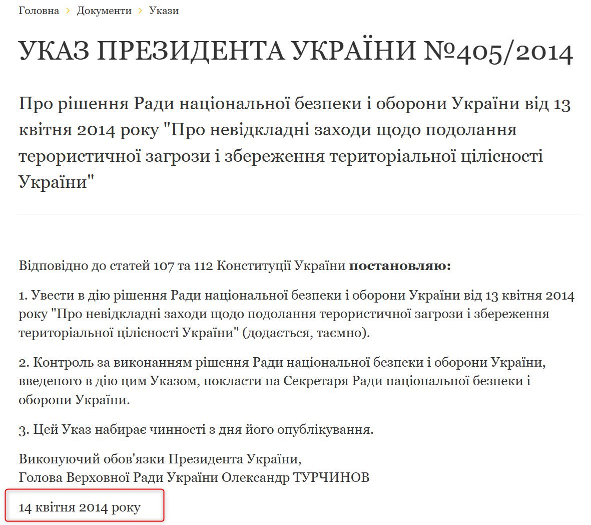 Но на самом деле это не так. Указ Турчинова о начале Антитеррористической операции был опубликован 14 апреля. Он вводил в действие соответствующее решение СНБО от 13 апреля. Это стало ответом на захват Славянска 12 апреля группой Гиркина-Стрелкова.