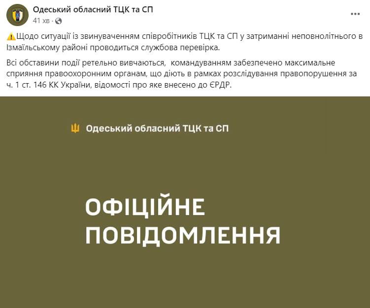 Также Одесский ТЦК начал служебную проверку по факту задержания военкомами 14-летнего парня.