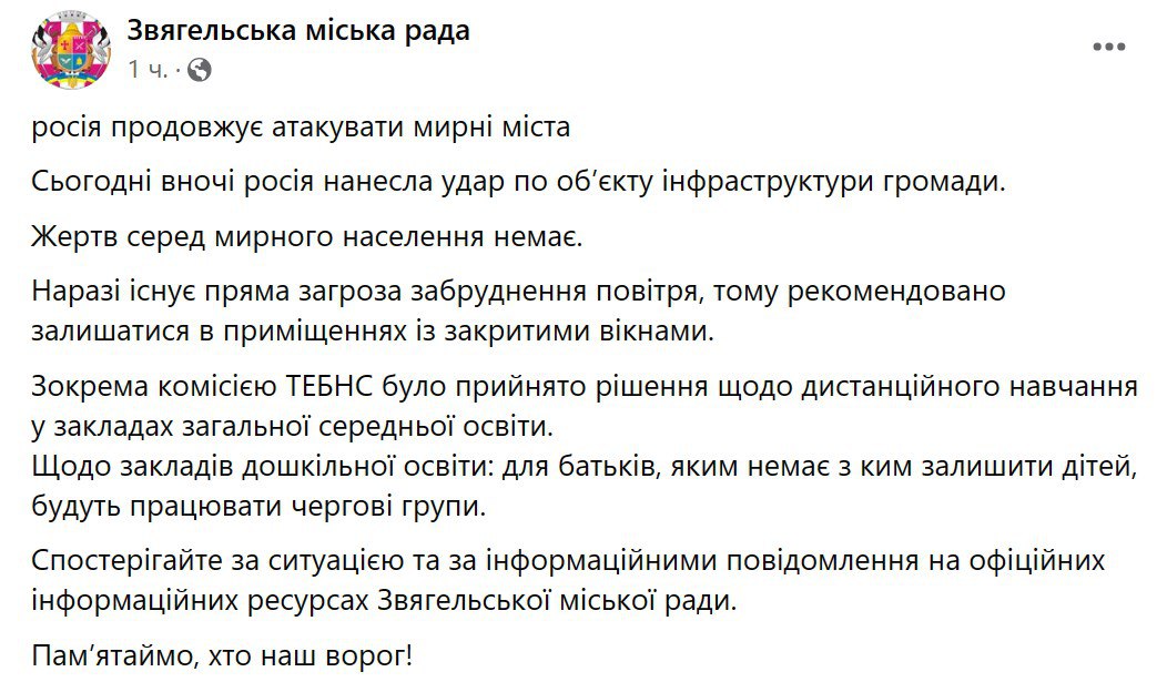 Власти Звягеля заявили об ударе, после которого есть риск загрязнения воздуха. Школы переведены на дистанционку.