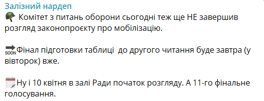 Оборонный комитет Верховной Рады сегодня не завершил рассмотрение законопроекта о мобилизации, но должен сделать это завтра.