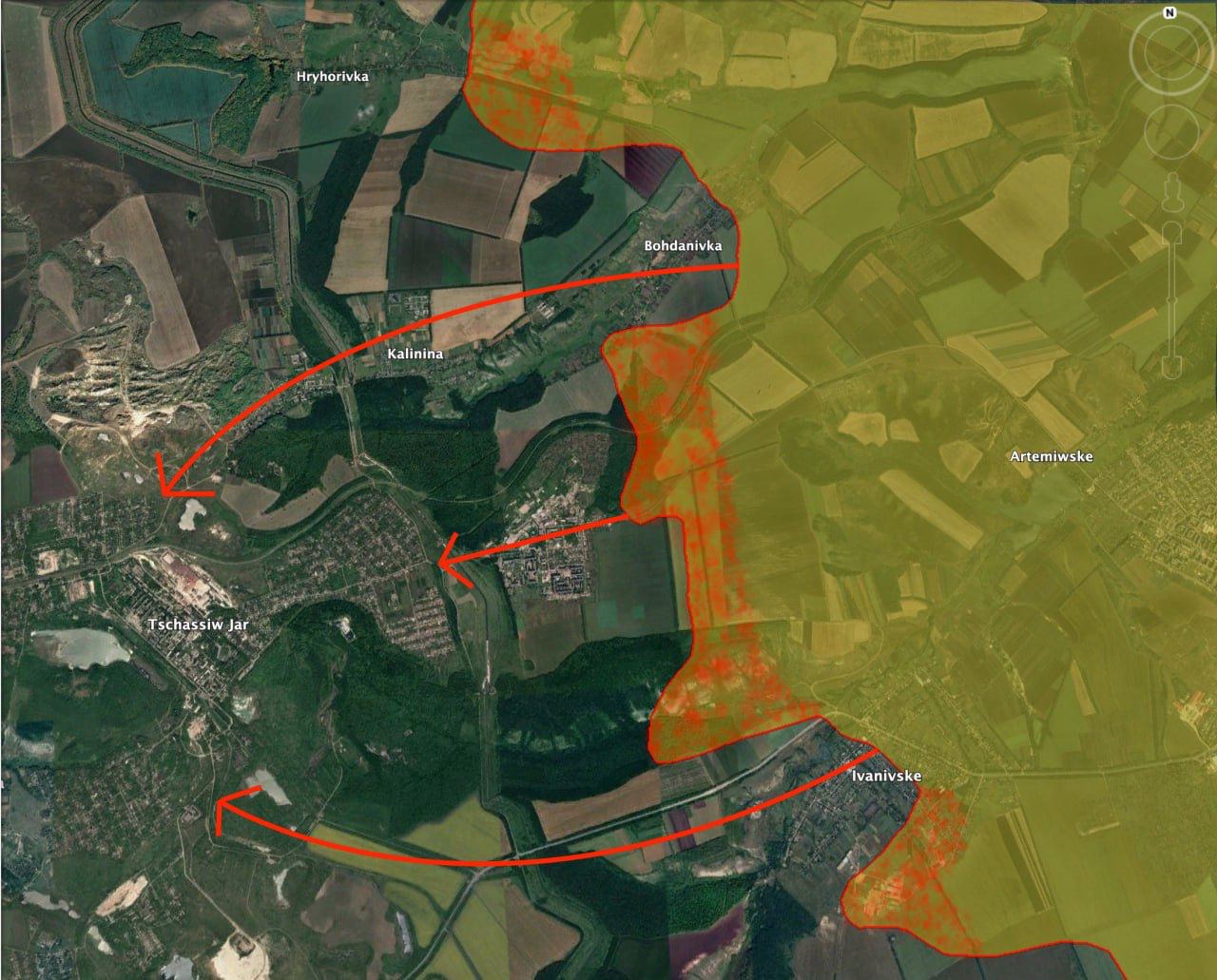 Россия наступает на Часов Яр Донецкой области, применяя тактику двойного удара: одновременно наносит фронтальный удар с востока и с флангов на юге и севере.