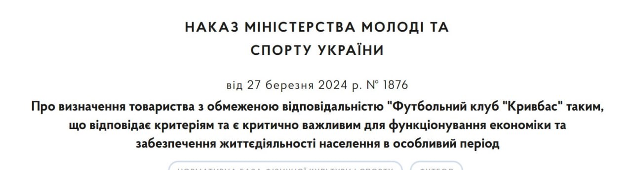 Министерство молодежи и спорта предоставило статус критически важных для функционирования экономики в особый период Украинской ассоциации футбола (УАФ) и нескольким футбольным клубам.