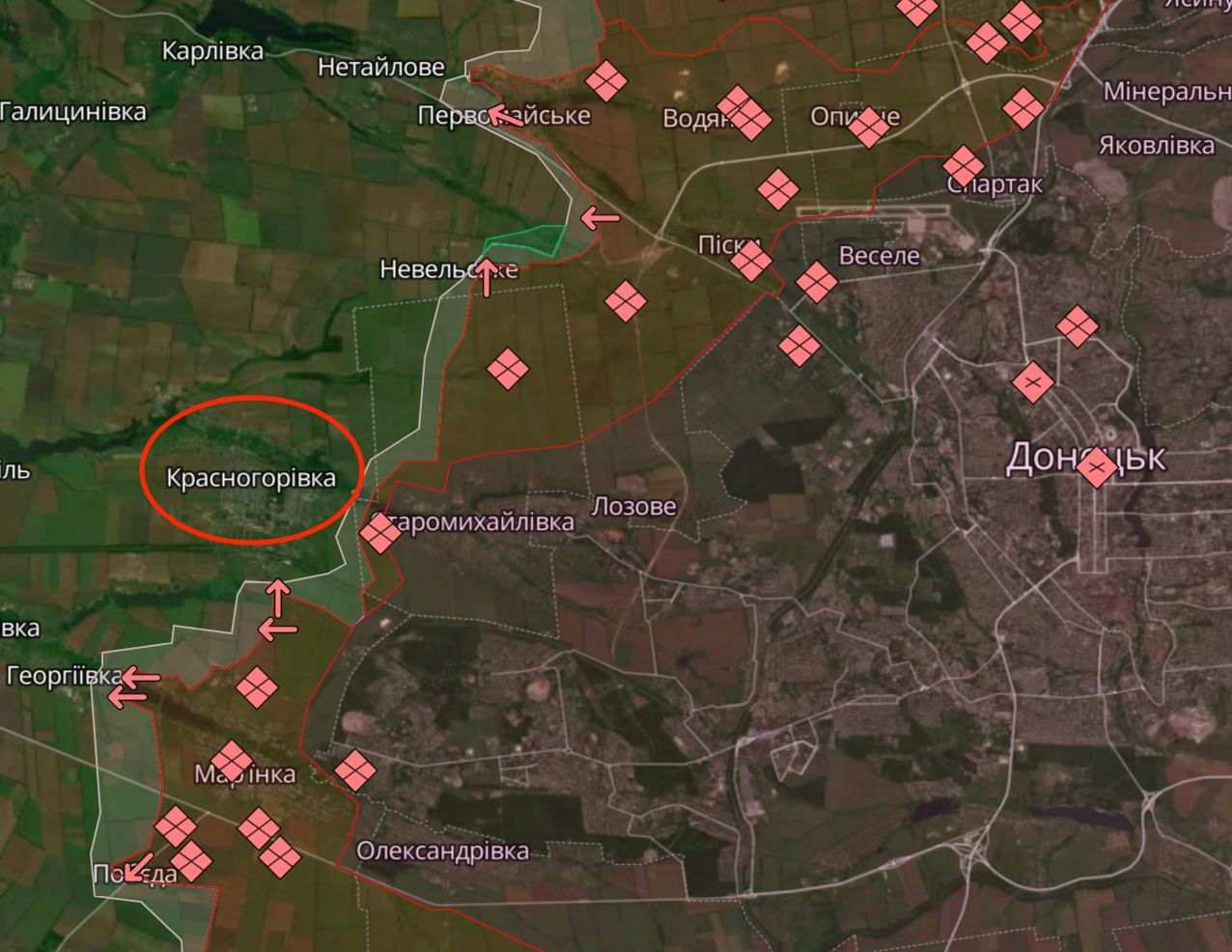 Российская армия вошла в Красногоровку Донецкой области. Город находится в 20 км к западу от Донецка и к северу от Марьинки. На этом участке у россиян с февраля 2022 года практически не было продвижения.