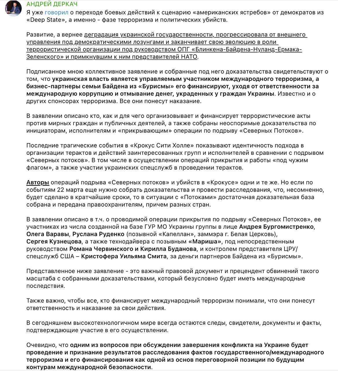 В целом заявление касается подрыва трубопровода, но Деркач в телеграм-канале утверждает, что "авторы операций подрыва «Северных потоков» и убийств в «Крокусе» одни и те же".