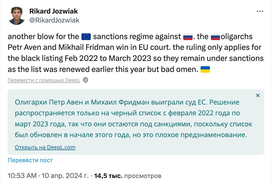Вскоре после появления этой новости журналист Рикард Йозвяк уточнил, что олигархи пока остаются под санкциями ЕС, так как решение суда распространяется только на черный список с февраля 2022 года по март 2023 года. А поскольку в начале 2024 года санкционный список был обновлен, ограничения в отношении Авена и Фридмана все еще в силе.