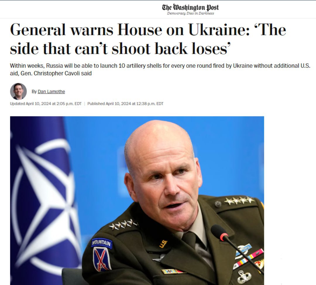 Командующий силами НАТО в Европе Кристофер Каволи заявляет, что через несколько недель Россия будет опережать Украину в артиллерии 10 к 1.