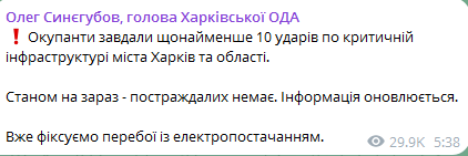 "Оккупанты нанесли по меньшей мере 10 ударов по критической инфраструктуре города Харькова и области. По состоянию на сейчас пострадавших нет. Уже фиксируем перебои с электроснабжением", - сказано в посте Синегубова.