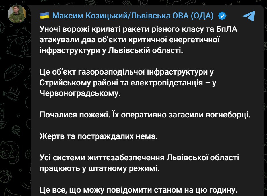 08:41 Ночью ракеты и БПЛА атаковали два объекта энергетики во Львовской области. Это газораспределительный объект в Стрыйском районе и электроподстанция – в Червоноградском.