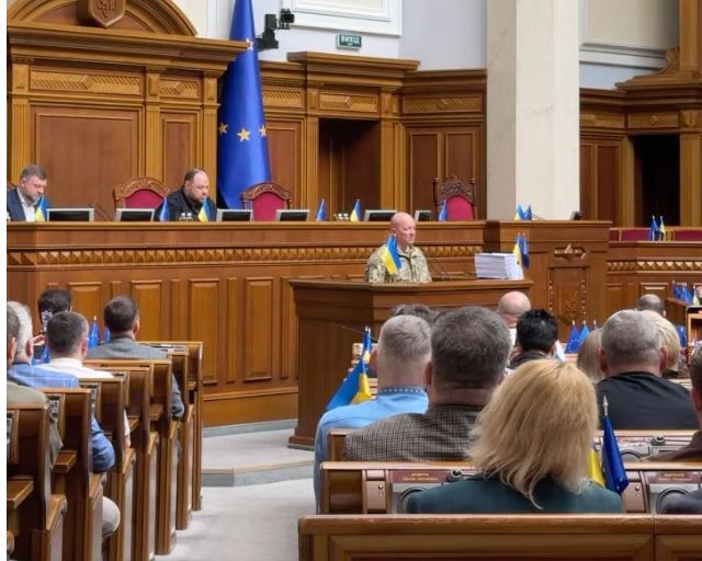 С трибуны парламента выступает командующий Объединенными силами ВСУ Юрий Содоль.
