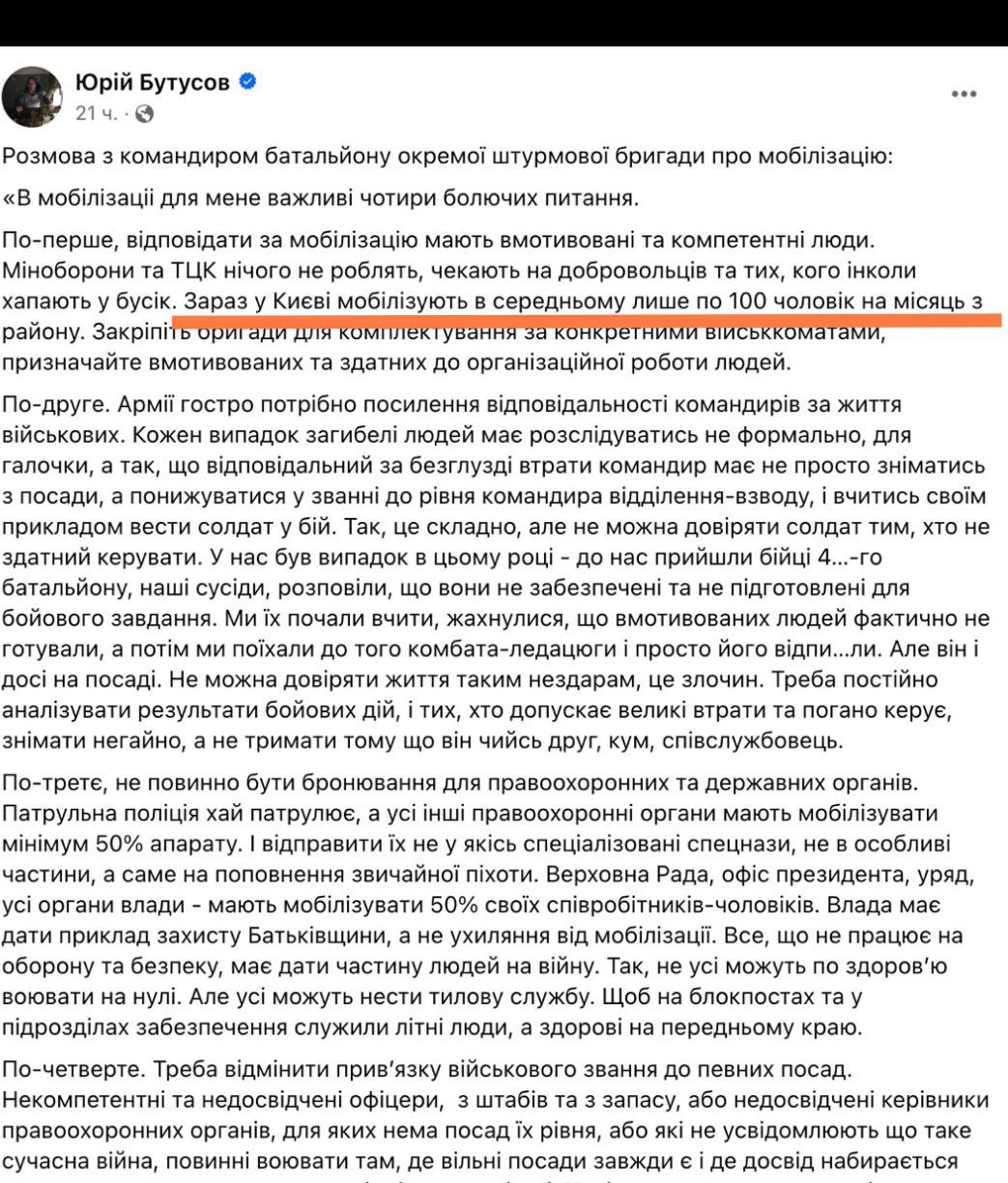В Киеве в среднем мобилизуют 100 человек из каждого района в месяц. В Киеве 10 районов. То есть, исходя из названной цифры, в месяц в столице мобилизуют около 1000 человек.