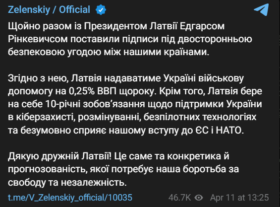 Сегодня, 11 апреля, президент Украины Владимир Зеленский подписал с латвийским коллегой Эдгарсом Ринкевичсом двустороннее соглашение по безопасности между странами.