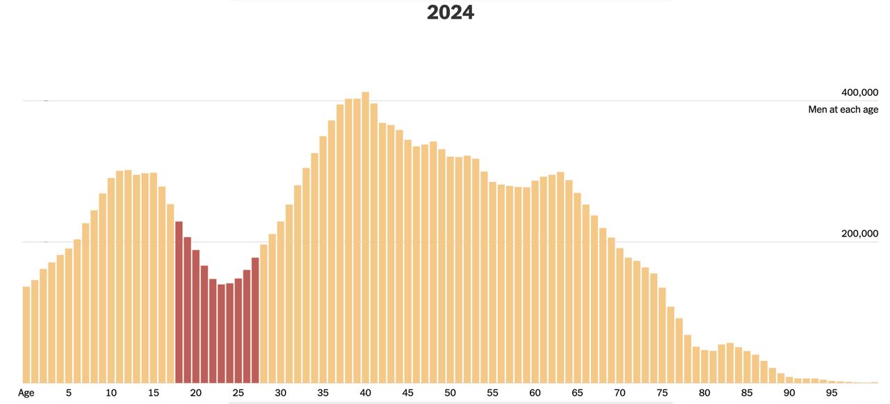В результате сейчас 40-летних мужчин в Украине более чем в два раза больше, чем мужчин 20-летних.