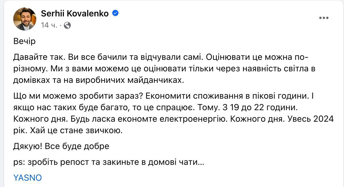 "Что мы можем сделать сейчас? Экономить потребление в пиковые часы. И если нас таких будет много, то это сработает. Поэтому. С 19 до 22 часов. Каждый день. Пожалуйста, экономьте электроэнергию. Каждый день. Весь 2024 год. Пусть это станет привычкой", - пишет он.