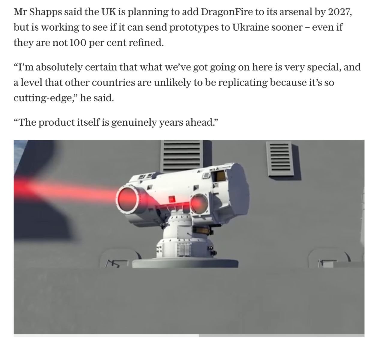 Напомним, DragonFire успешно протестировали  в январе этого года. Заявлено, что лазер очень точно бьет прямым лучом, может поражать видимые цели со скоростью света и при этом очень дешевый в использовании.
