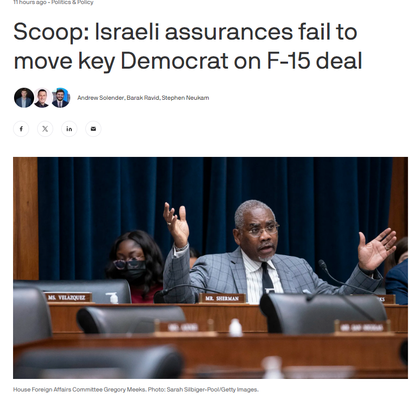 Член Палаты представителей США Грегори Микс, демократ из Нью-Йорка, который занимает важную должность в комитете по иностранным делам, отказывается утвердить поставку истребителей четвёртого поколения F-15 в Израиль.
