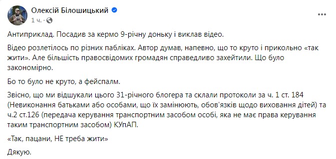 "Антипример. Посадил за руль 9-летнюю дочь и выложил видео. Видео разлетелось по разным пабликам. Автор думал, наверное, что это круто и прикольно "так жить". Но большинство правосознательных граждан справедливо захейтили. Что было закономерно. Потому что это было не круто, а фейспалм", - написал Белошицкий.