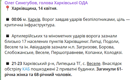 Также артиллерийским и минометным ударам РФ подверглись около 17 населенных пунктов Харьковщины, в частности Липцы, Подолы, Веселое и другие.