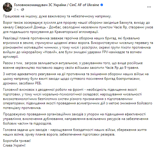 Российское военное руководство поставило задачу взять Часов Яр до 9 мая. РФ сосредотачивает усилия для прорыва обороны западнее Бахмута, чтобы выйти к каналу Северский Донец-Донбасс и захватить Часов Яр.