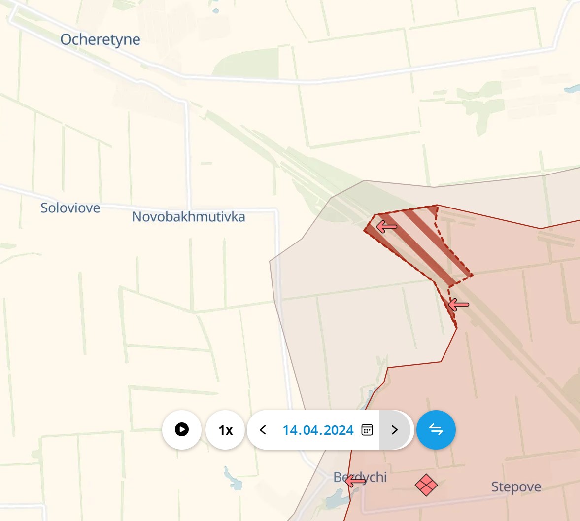 Это направление на Очеретино - ключевой узел обороны ВСУ на этом участке фронта (он находится на возвышенности). Недавно по селу резко усилились российские авиаудары. После российского продвижения к Новобахмутовке до Очеретино от линии фронта уже менее двух километров.