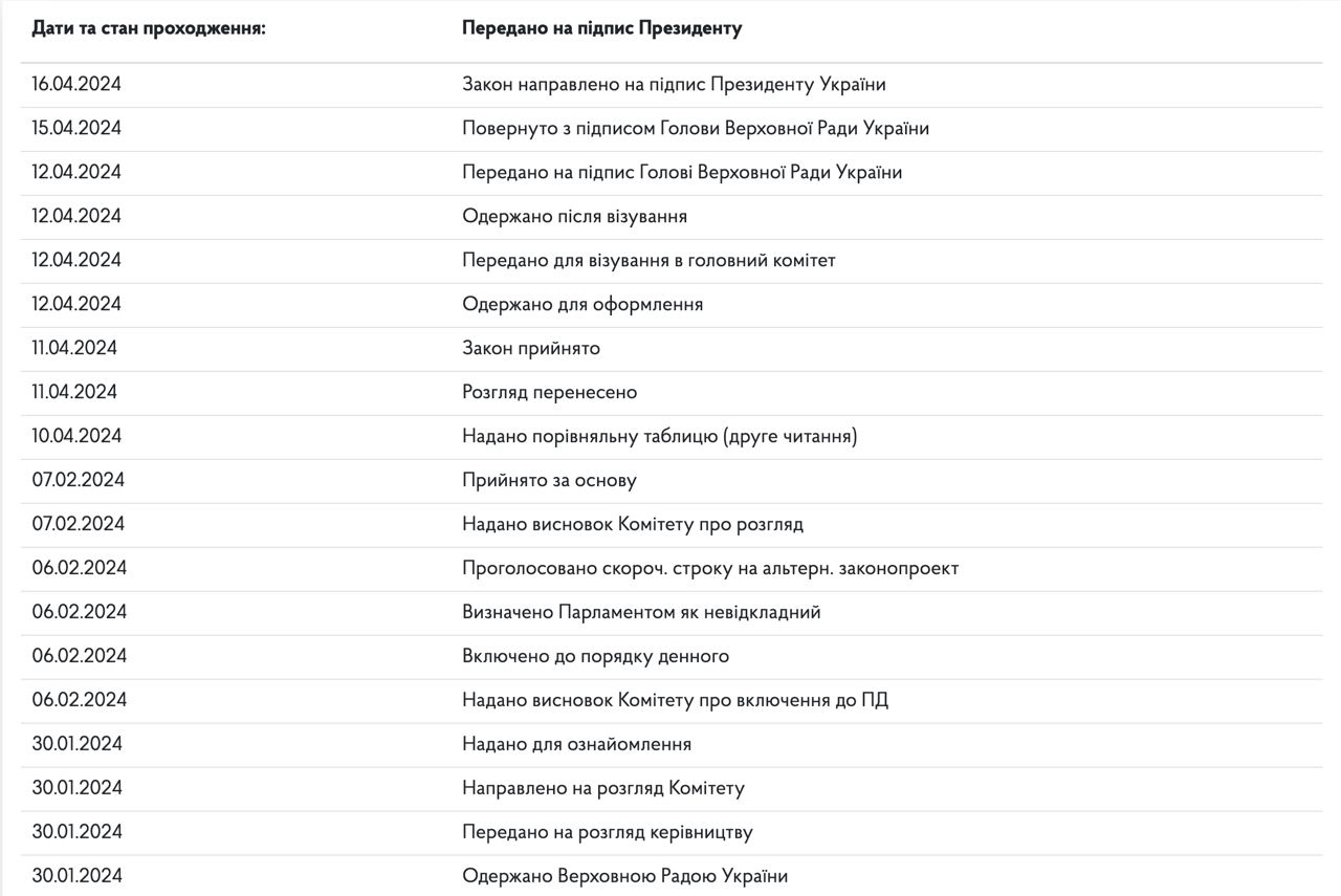 В карточке законопроекта на сайте Верховной Рады говорится, что документ уже подписан спикером парламента Русланом Стефанчуком и направлен на подпись президенту.
