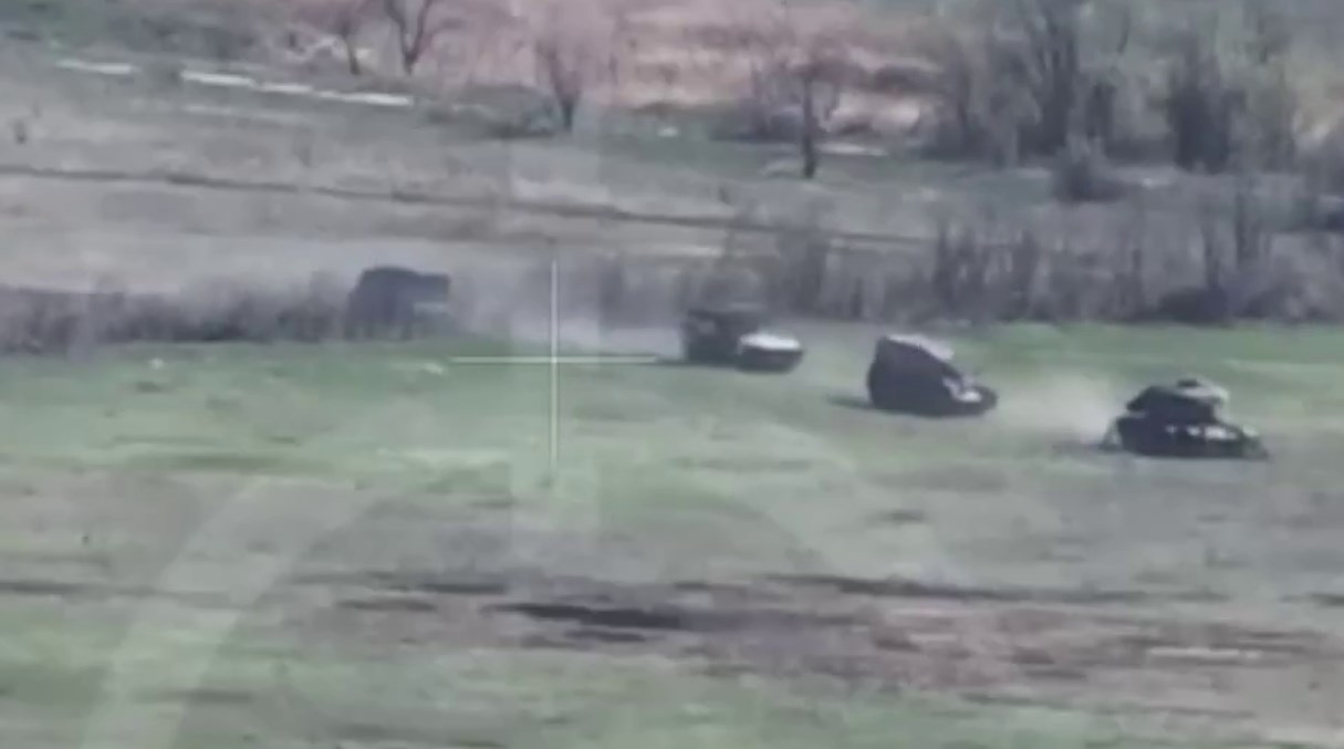 На кадрах заметно, что сперва колонны по четыре и три машины едут по открытой местности, где по ним бьет артиллерия, но промахивается. Затем они заезжают в городскую застройку.