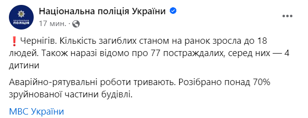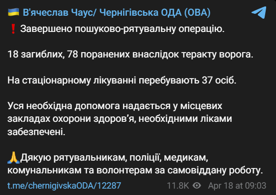 07:40 Число погибших в Чернигове после вчерашнего удара выросло до 18. Еще 77 человек пострадали, среди них четверо детей.