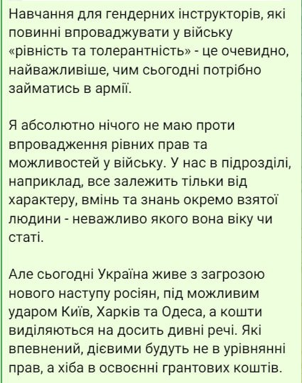 "Сегодня Украина живет с угрозой нового наступления россиян. Под возможным ударом Киев, Харьков и Одесса, а средства выделяются на удивительные вещи. Которые, уверен, действенными будут не в уравнивании прав, а разве что в освоении грантовых средств", – написал Жорин.