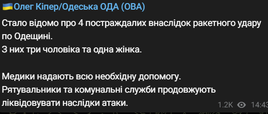 "Стало известно о 4 пострадавших в результате ракетного удара по Одесской области. Из них три мужчины и одна женщина. Медики оказывают всю необходимую помощь", - написал он.