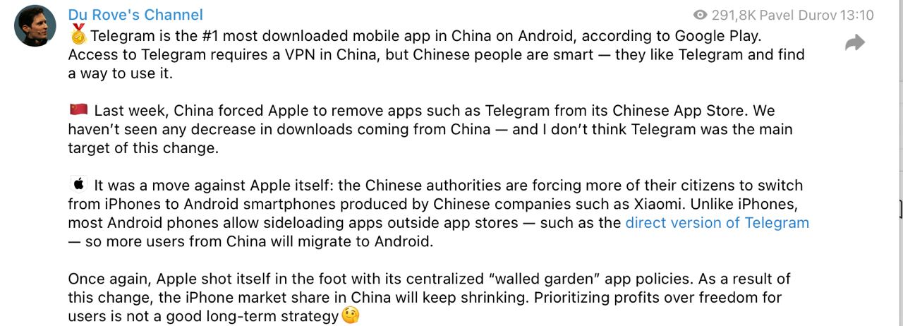 "Телеграм - самое скачиваемое мобильное приложение №1 в Китае на Android, согласно данным Google Play. Для доступа к Телеграму в Китае требуется VPN, но китайцы умны - им нравится Телеграм, и они находят способ его использовать. На прошлой неделе Китай заставил Apple удалить такие приложения, как Телеграм, из китайского App Store. Мы не заметили снижения количества загрузок из Китая", - заявил Дуров.