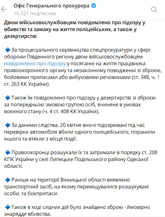 Двоим военным, которые на выходных в Винницкой области убили одного полицейского и ранили другого правоохранителя при попытке обыска авто, сообщили о подозрении.