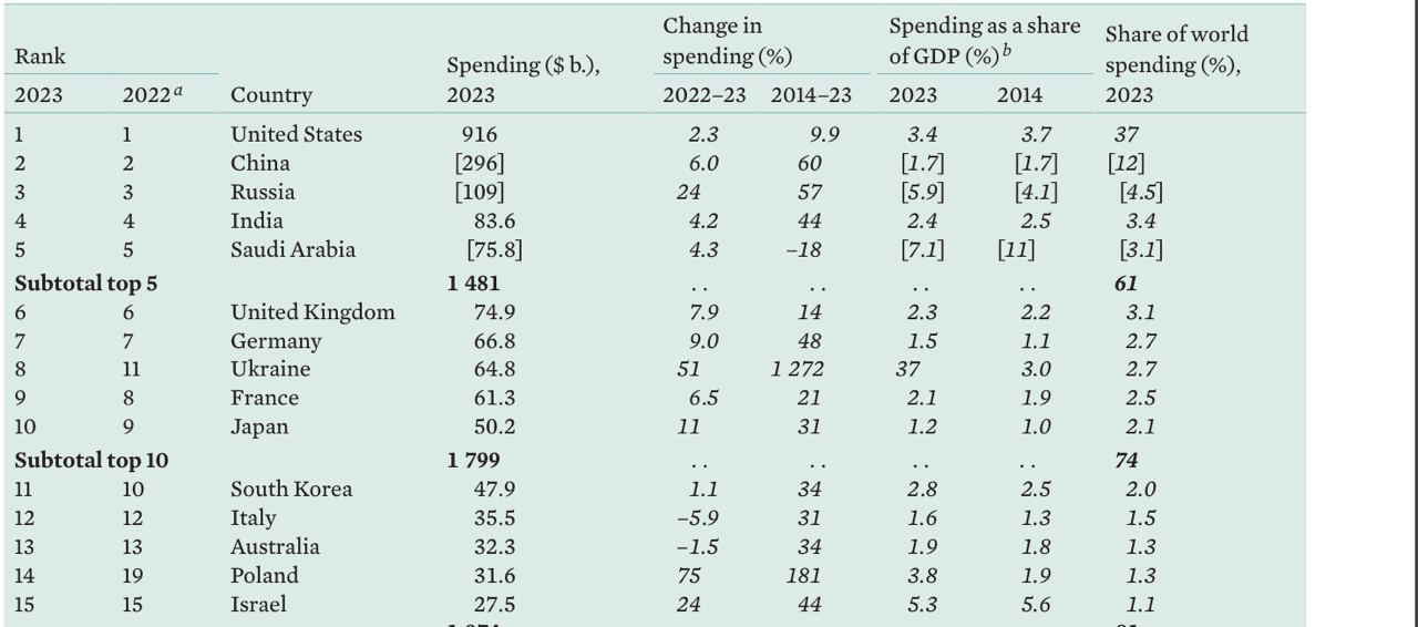 В целом военные расходы Украины выросли на 51% — до 64,8 млрд долларов. Таким образом Украина переместилась с 11-го места по военным тратам в 2022 году на 8-е место в 2023 году.