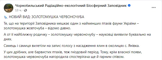 "О том, что на территории заповедника обитает одна из самых маленьких птиц фауны Украины – желтоголовый королёк, - известно давно. А вот ее ближайшую родственницу красноголового королька ученые обнаружили буквально на днях", - сказано в посте.